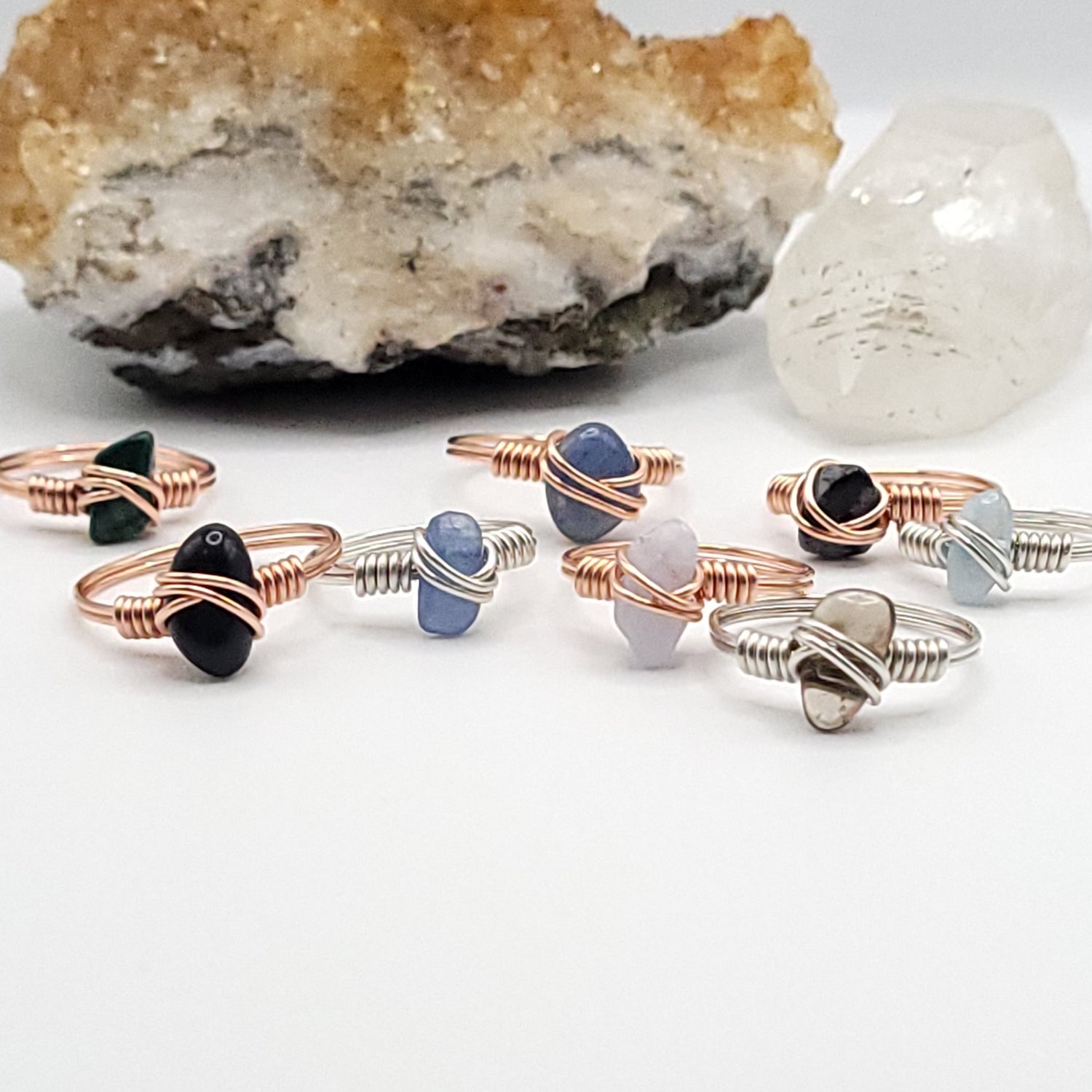 Wire-wrapped crystal rings in copper and sterling silver. Intentional, earthy, and made...