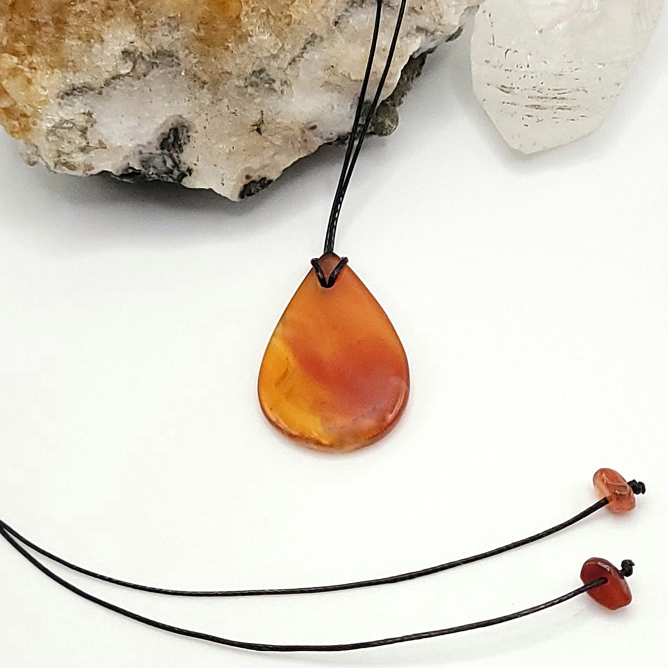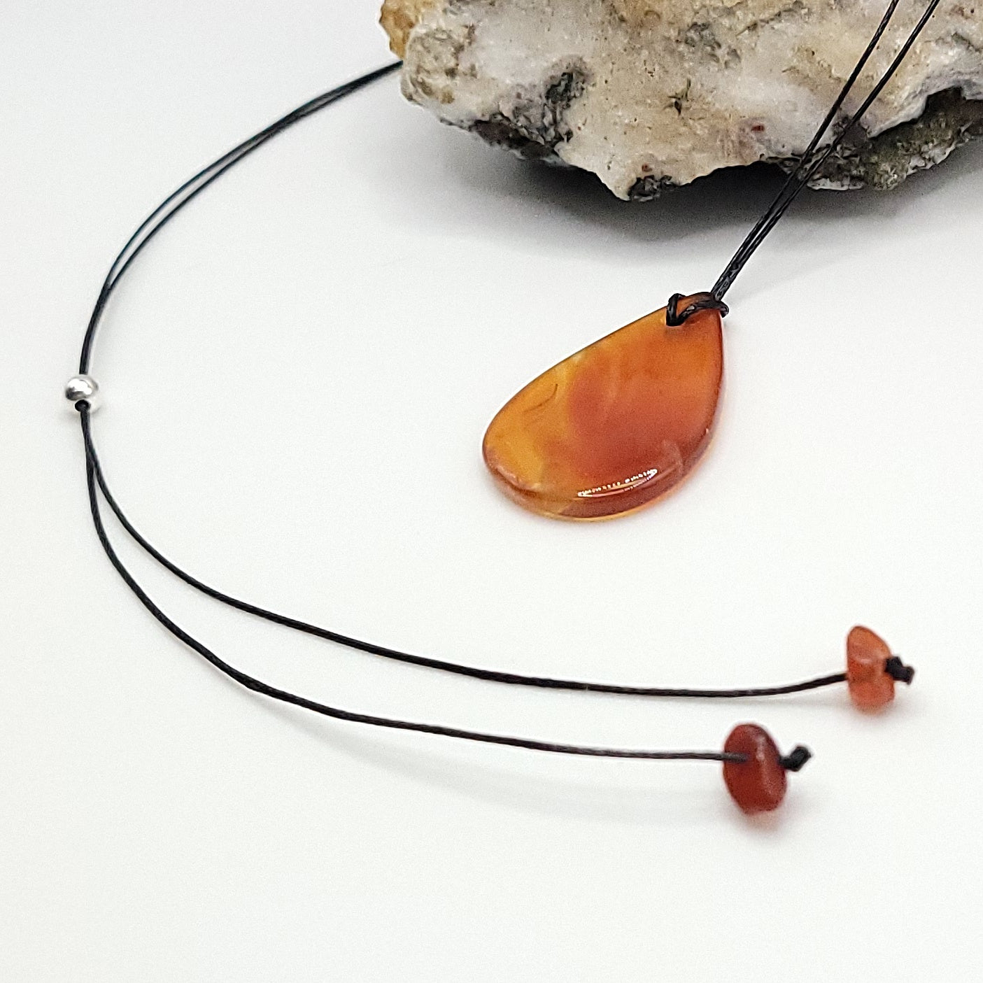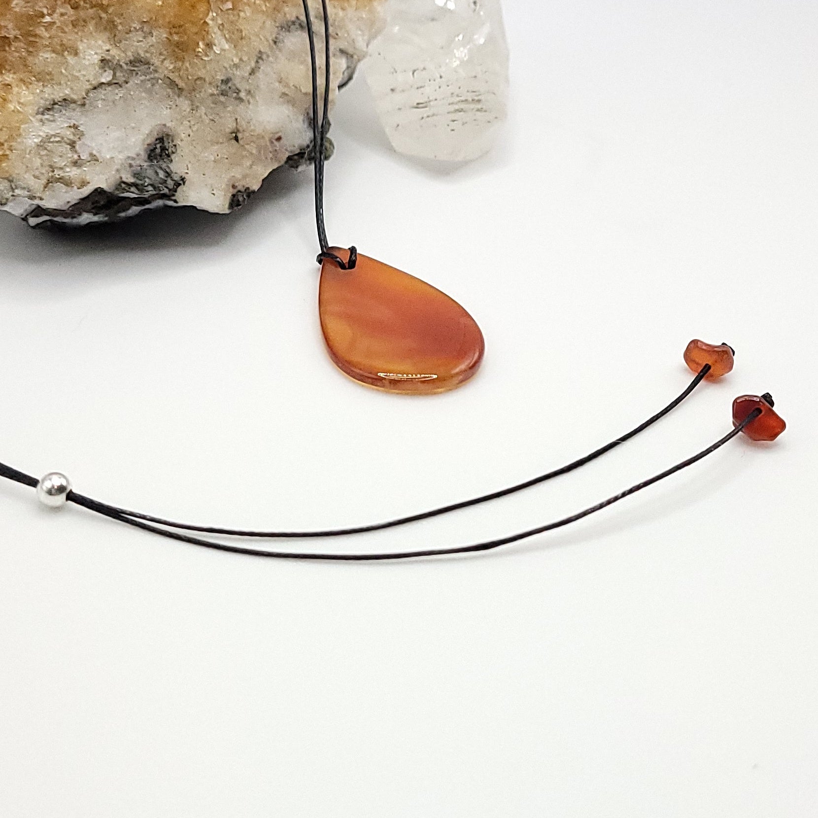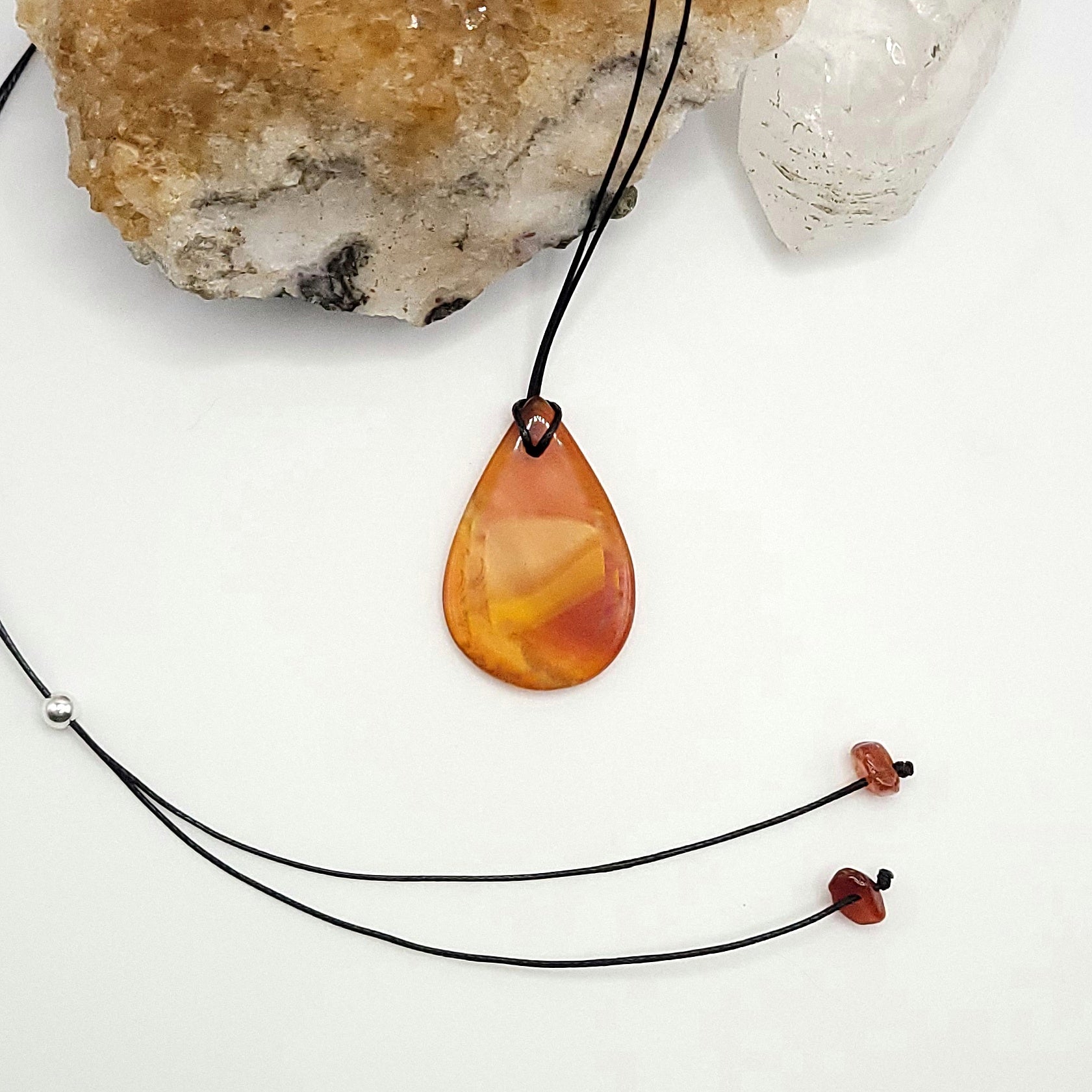 This adjustable Carnelian necklace is made with black waxed cotton cord and a sterling silver sliding bead to adjust length from choker up to 24".