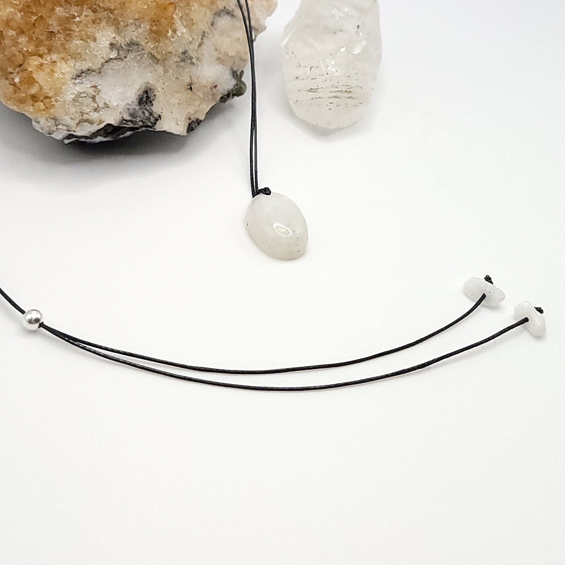 This adjustable Moonstone necklace is made with black waxed cotton cord and a sterling silver sliding bead to adjust length from choker up to 24".