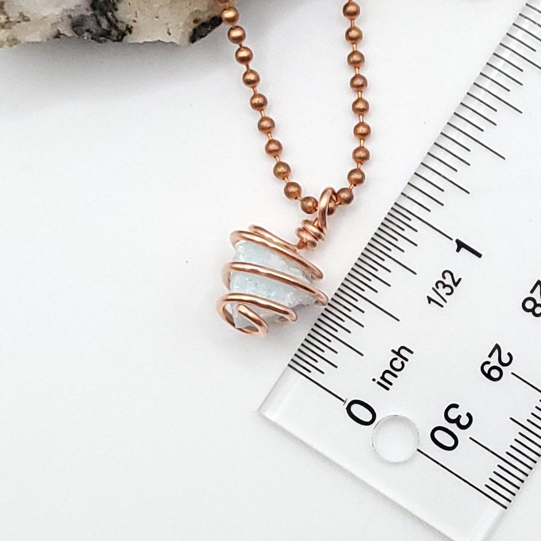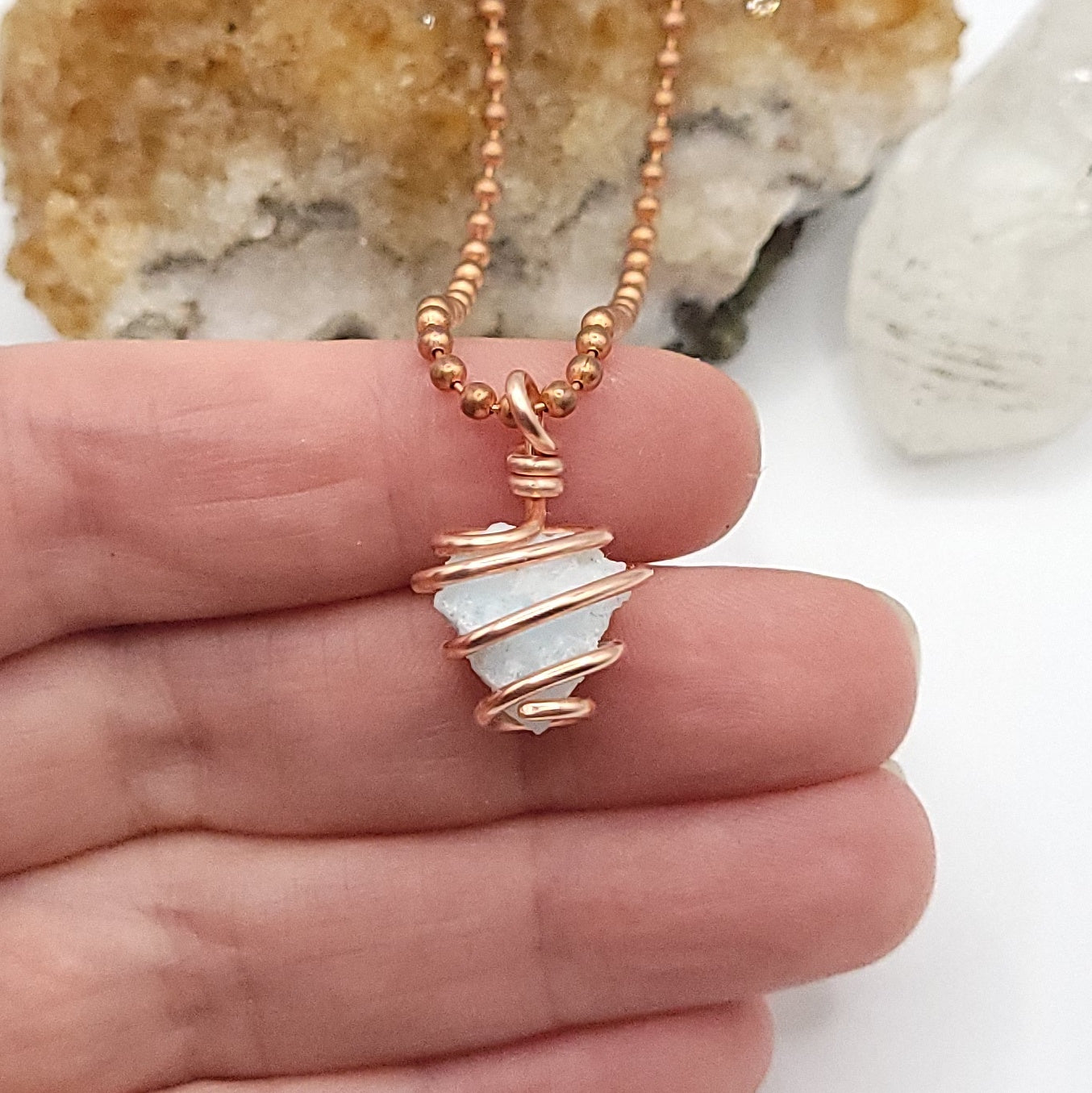 This raw Blue Aragonite is wrapped in pure copper wire. It includes a copper ball chain or black or brown faux suede cord (cord adjusts from 12"-24")