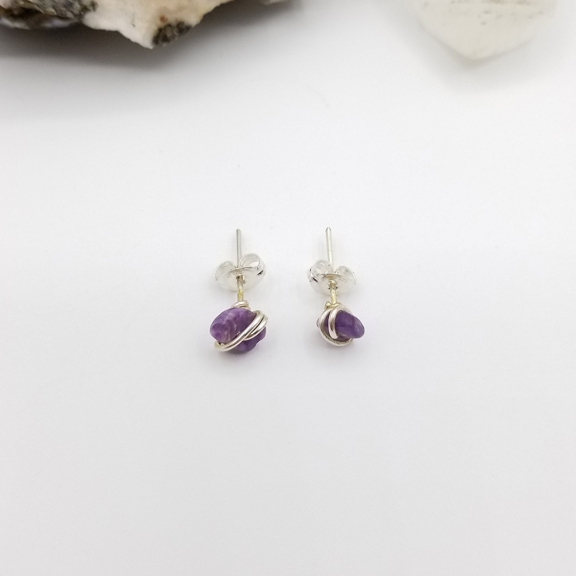 Beautiful little Charoite and sterling silver wire wrapped stud earrings