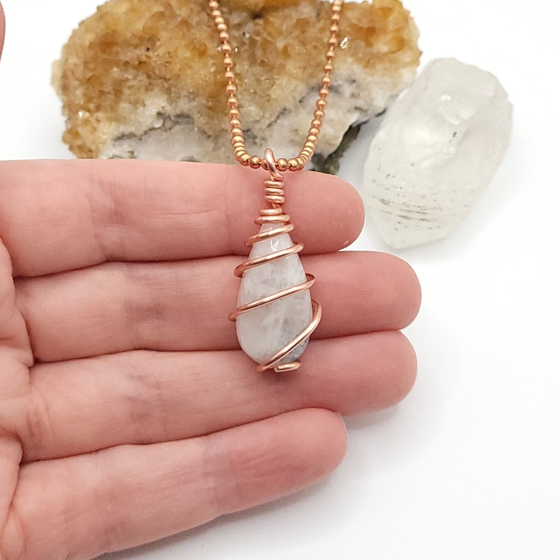 This beautiful, polished Rainbow Moonstone is wrapped with copper wire includes a copper ball chain or a black or brown adjustable faux suede cord (adjusts from about 12"-24")