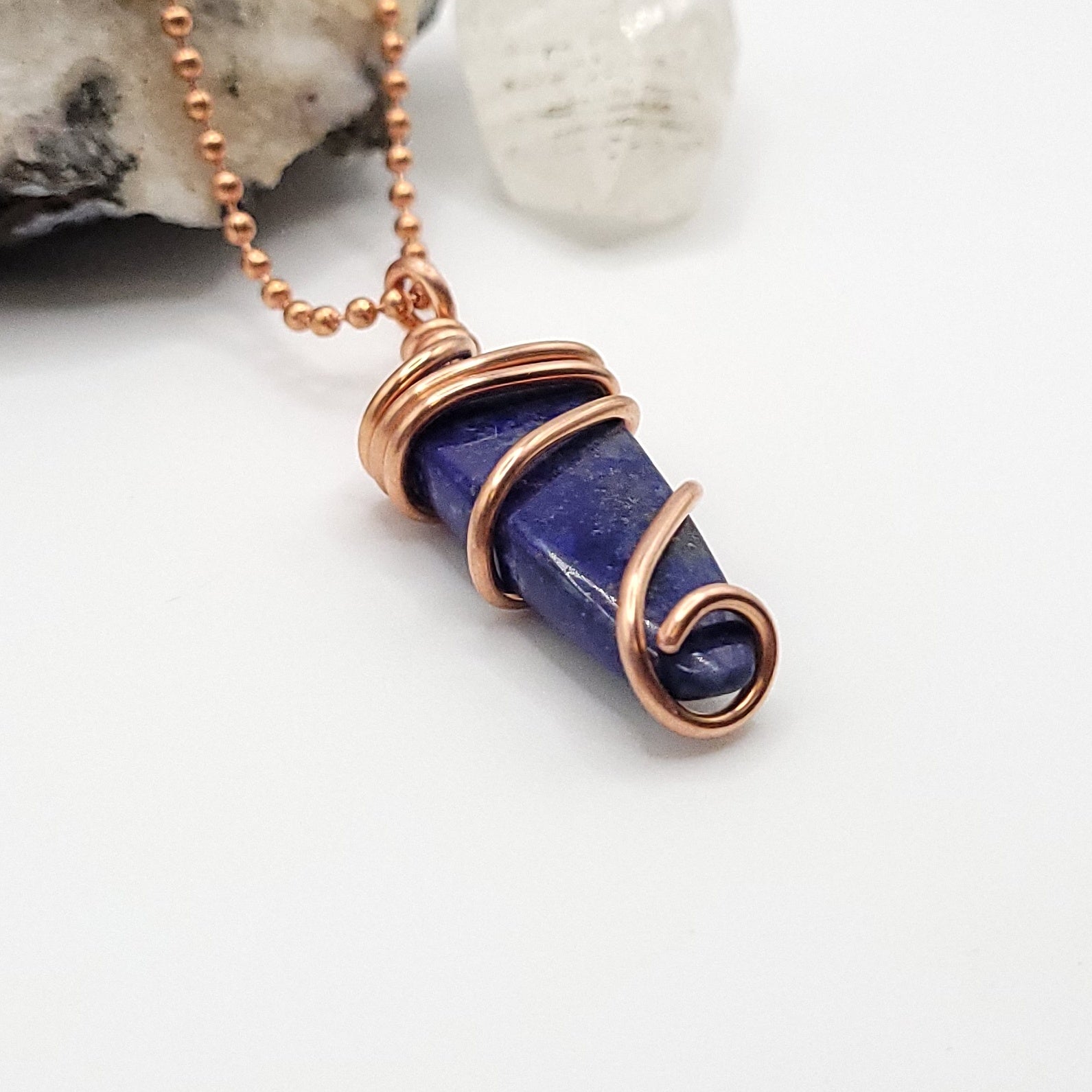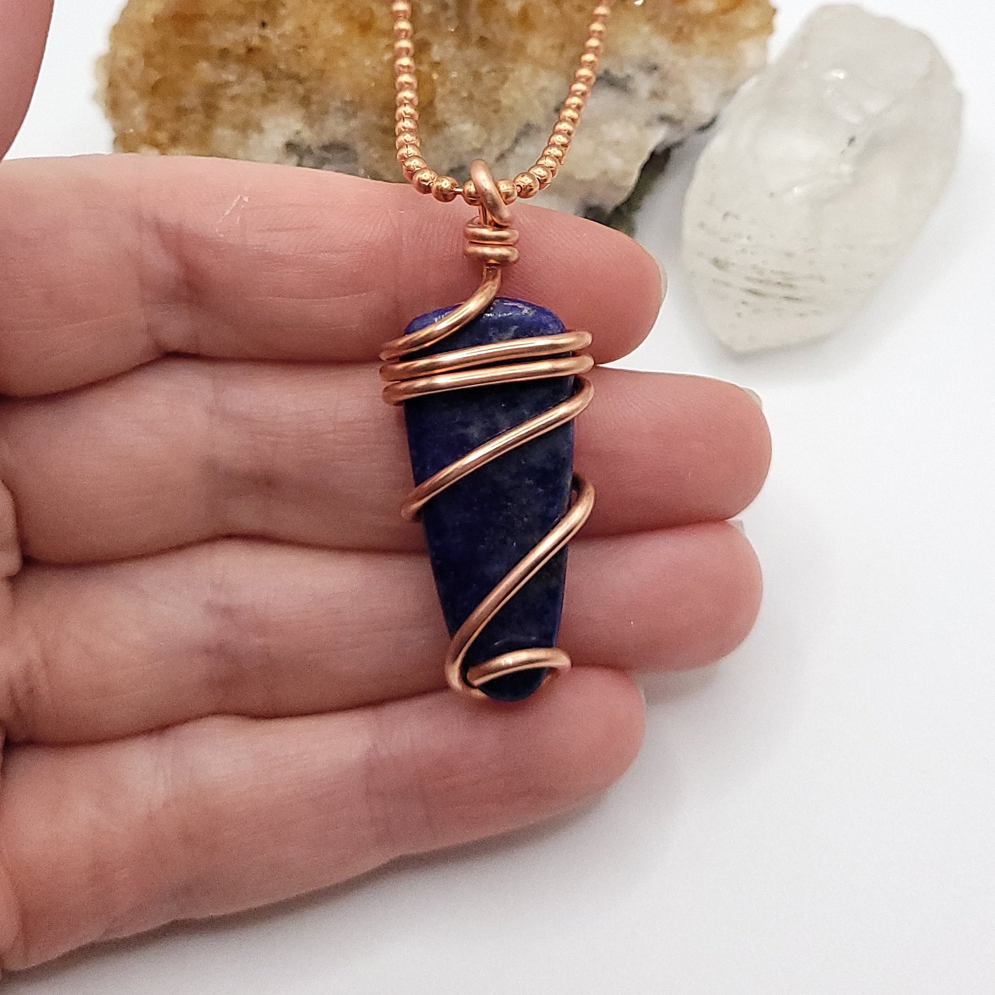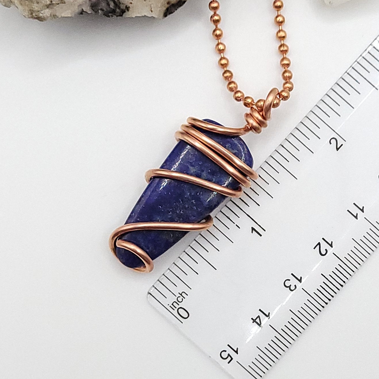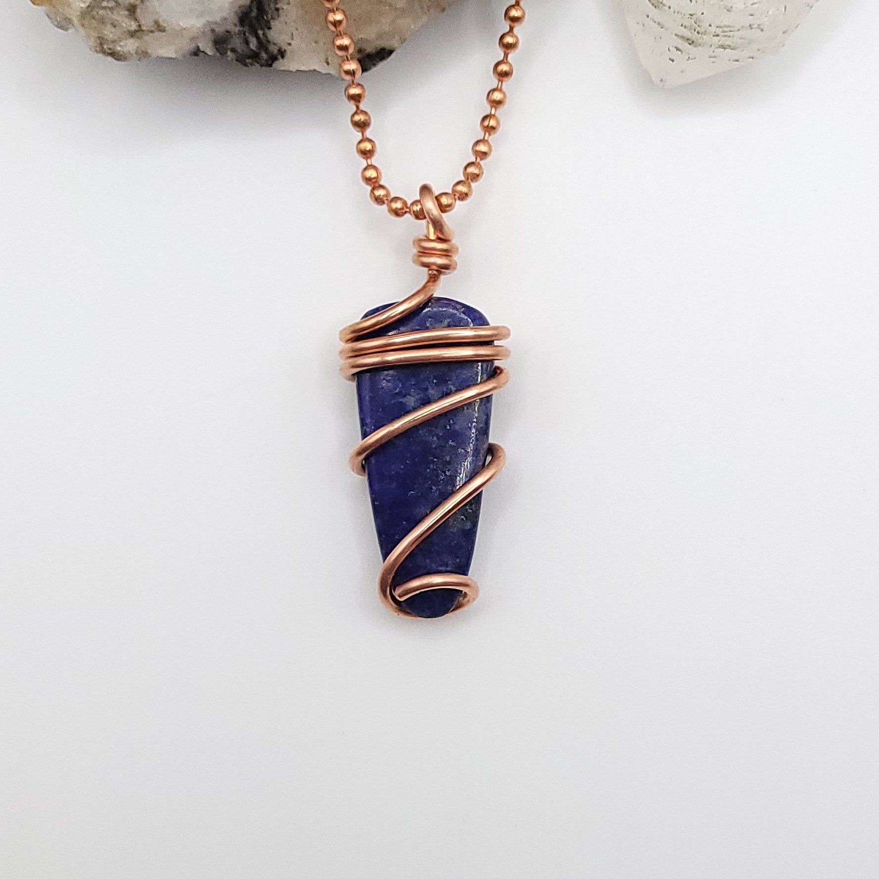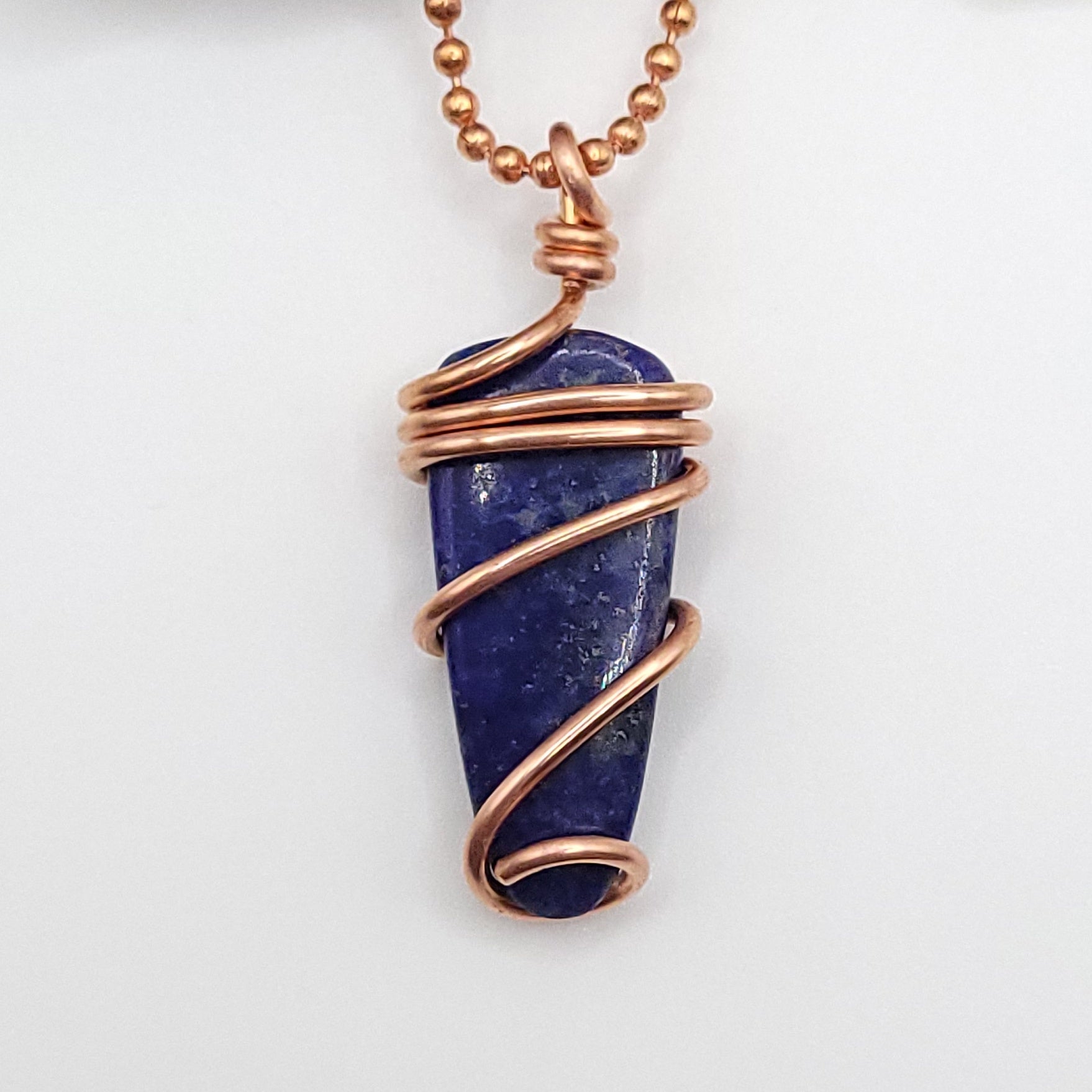 This beautiful, polished Lapis Lazuli is wrapped with pure copper wire. It includes a copper ball chain or a black or brown adjustable faux suede cord (adjusts from about 12"-24")