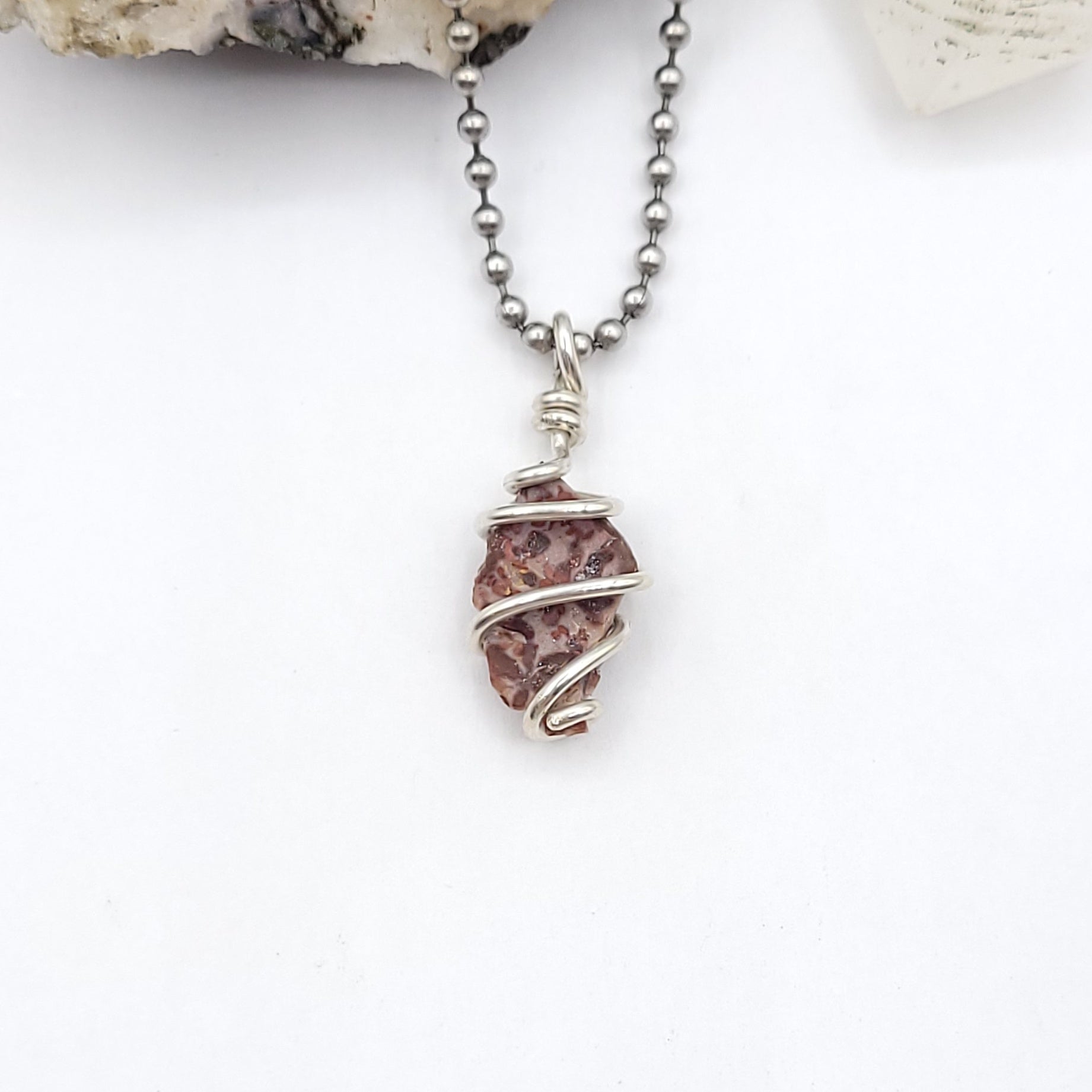 This beautiful raw Leopard Skin Jasper crystal is wrapped in .925 sterling silver wire. It includes a complimentary stainless steel ball chain or black or brown faux suede cord.