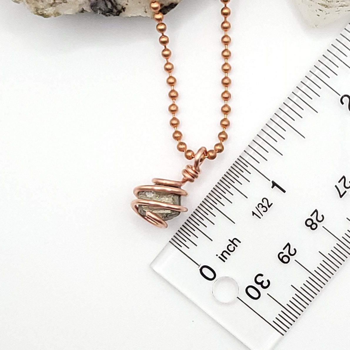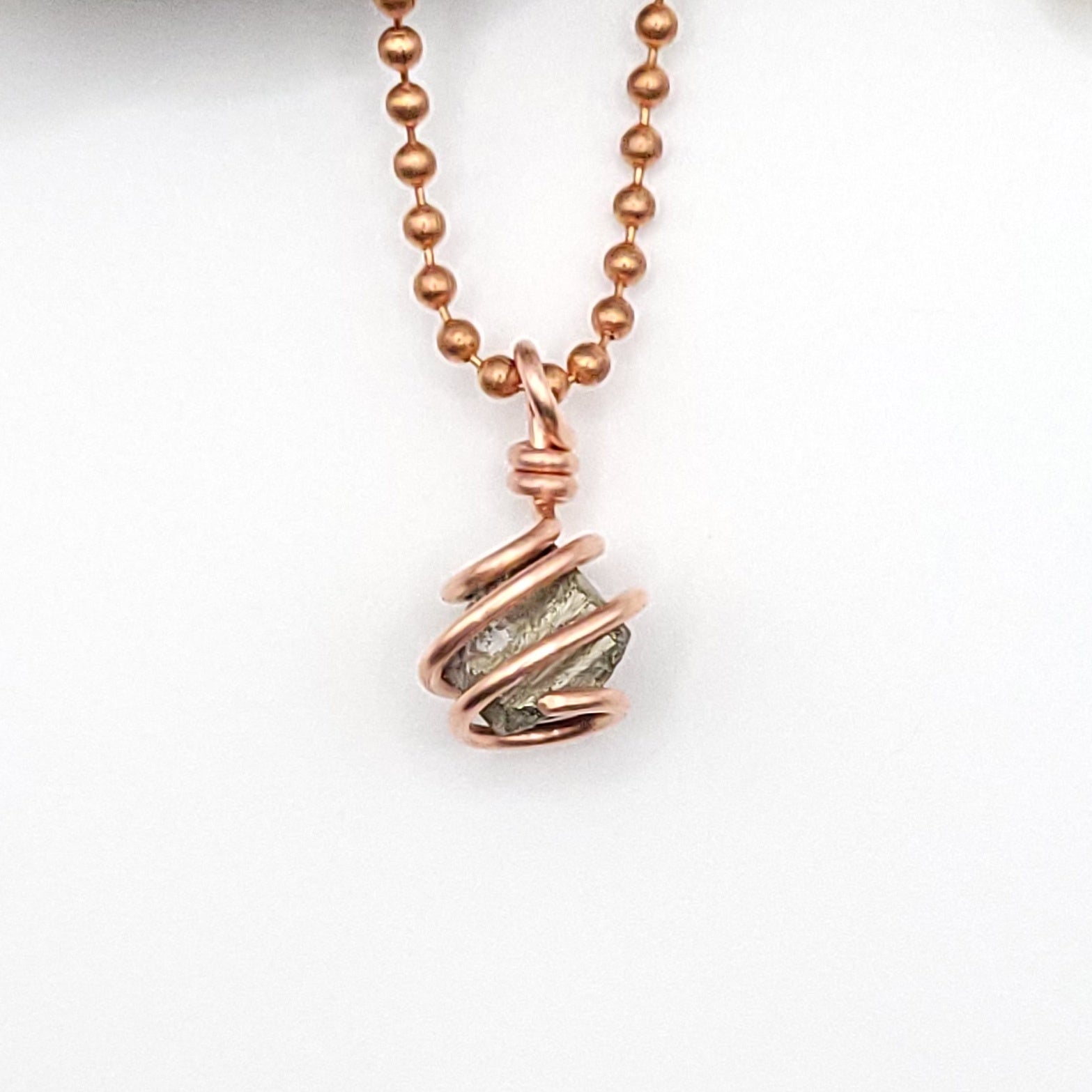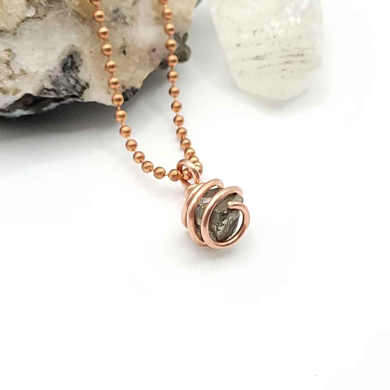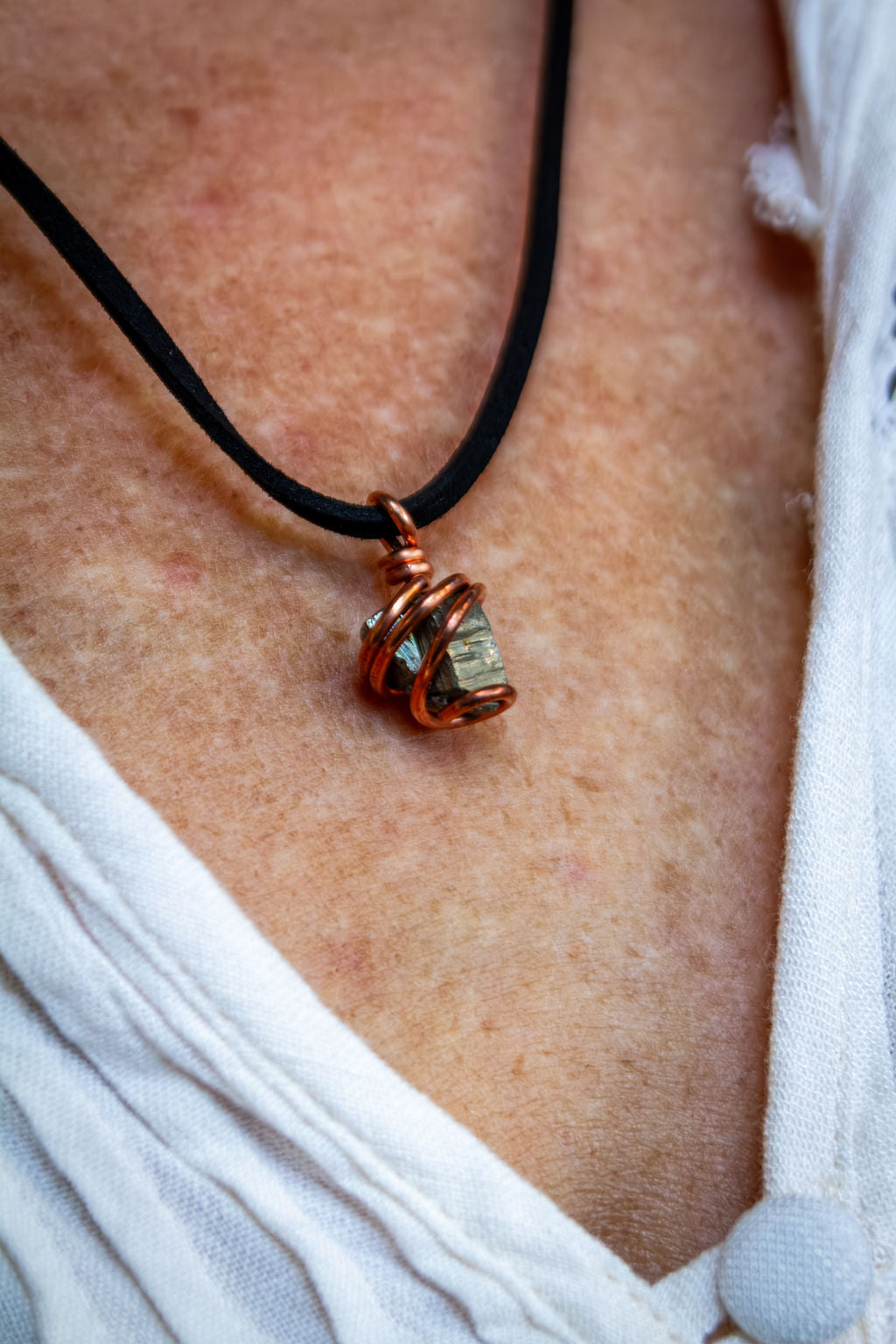 This little raw Pyrite is wrapped in pure copper wire. It includes a copper ball chain or black or brown faux suede cord (cord adjusts from 12"-24")