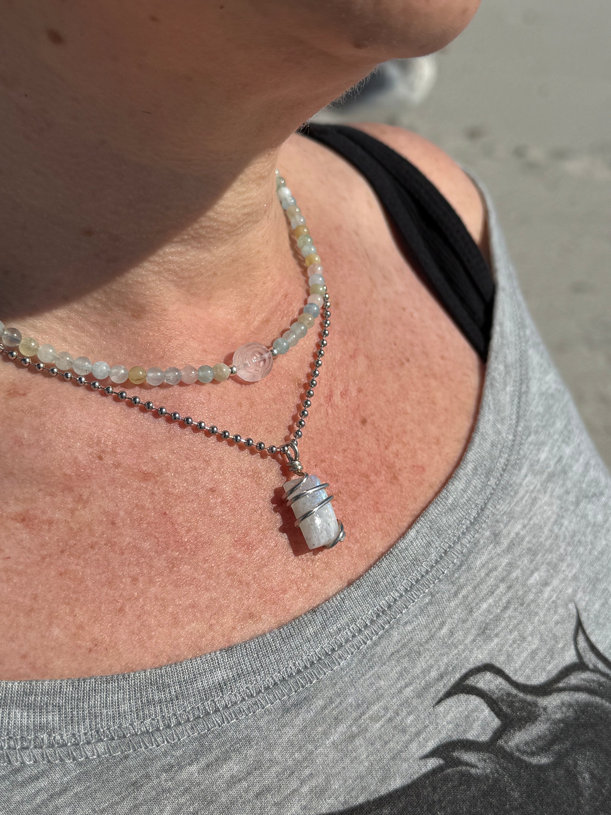 This Rose Quartz Evil Eye necklace is strung with 4mm Morganite beads - two gentle stones that open the heart and calm the spirit. Rose Quartz carries the frequency of unconditional love, while Morganite soothes stress and restores emotional balance. Together they form a shield of compassion that protects your peace without hardening your heart.